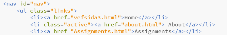This is a screenshot from my Brackets session, an consists of the links in my menu tab. This is one of the many buttons I linked together, with the goal that everything "worked" right from the beginning.