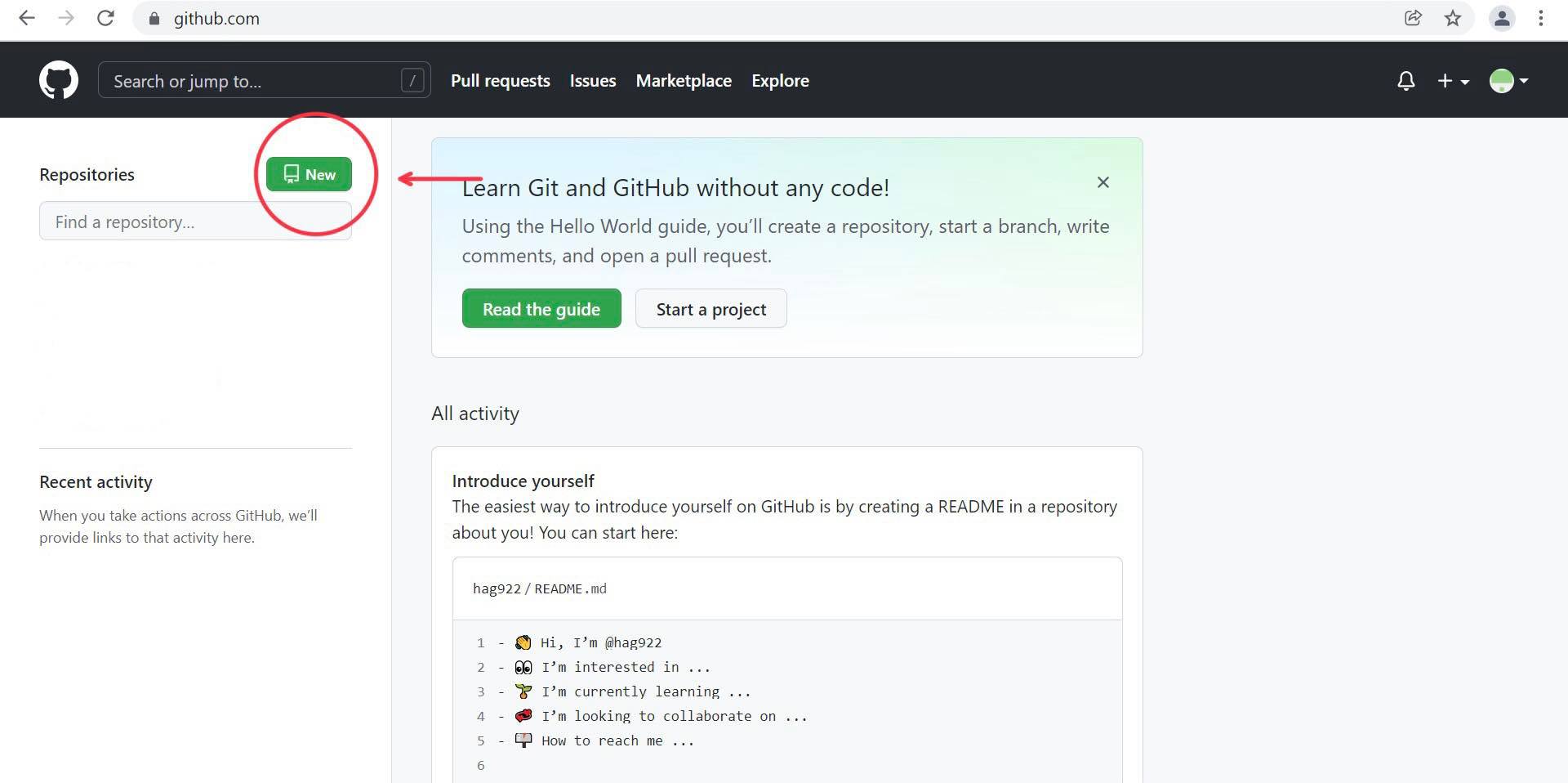 The first thig you should do is open Github, (create an account if you haven't already) and create a repository by clicking new.