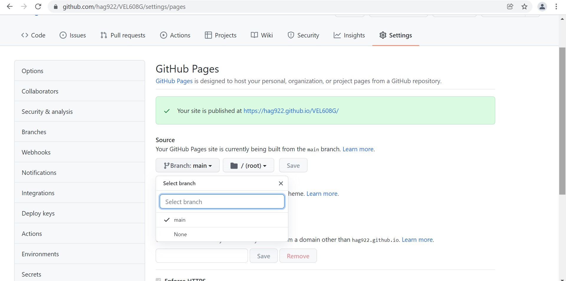 When you've opened settings, click on the Branch drop down, and choose main instead of none. Then click save