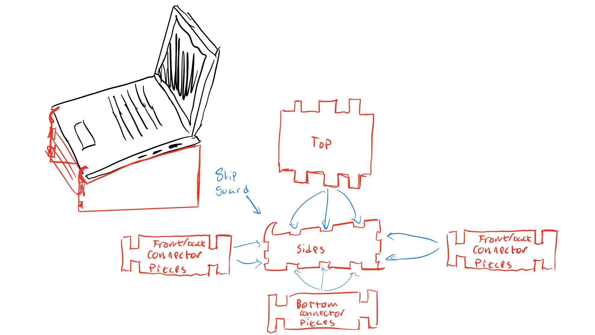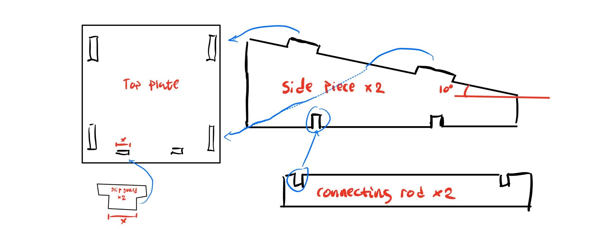 First I started by schetching a rough draft as to how i wanted the stand to function. After a little test with a spirit level, I found a 10° tilt upwards to be the best choice for my computer. Below you can see my first, rough draft: