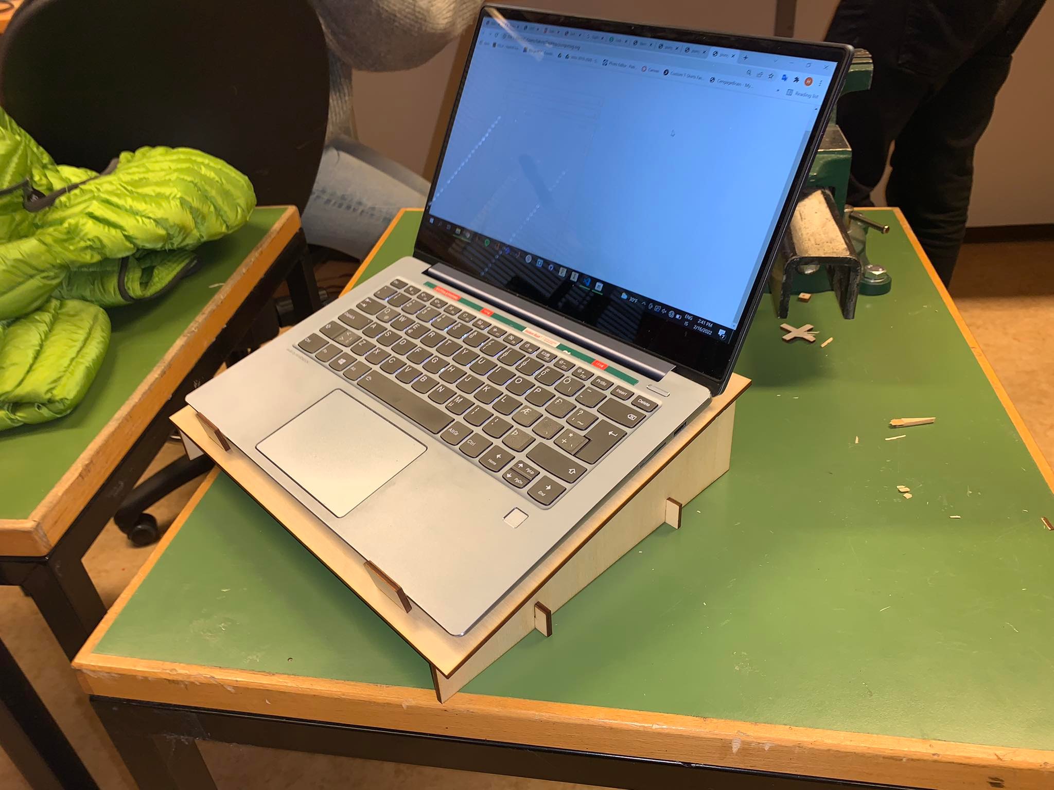 The program used in the laser cutting process is Inkscape. The program is pretty straightforward, an with a little advisement from my tutor I managed to laser cut my stand. The assignment Laser cutting was a success aside from one problem. The plate used to cut from was considerably warped, so the assembly proved probematic. However I managed to put everything together and after pressing the plate with a heavy atlas it corrected itself considerably. All in all a successful project. Below you can see some photos of the completed and assembled stand.
