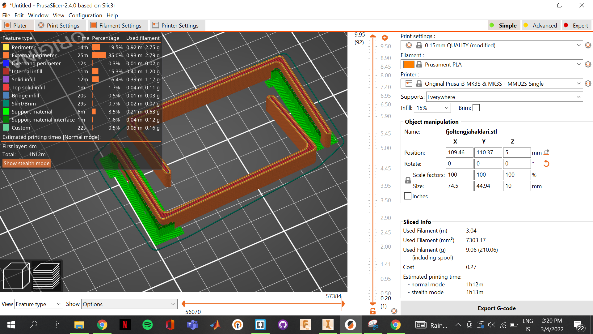 As you can see I decide to use a 15% infill, due to it being necessary to bend the object. The filament used was a generic, black PLA filament and you need to make sure you update the settings in the prusa slicer application. If you are printing a large object which does not need extremely precise prints you can also set the speed at the top (I used 0.15mm quality) where the units tell you the precision.