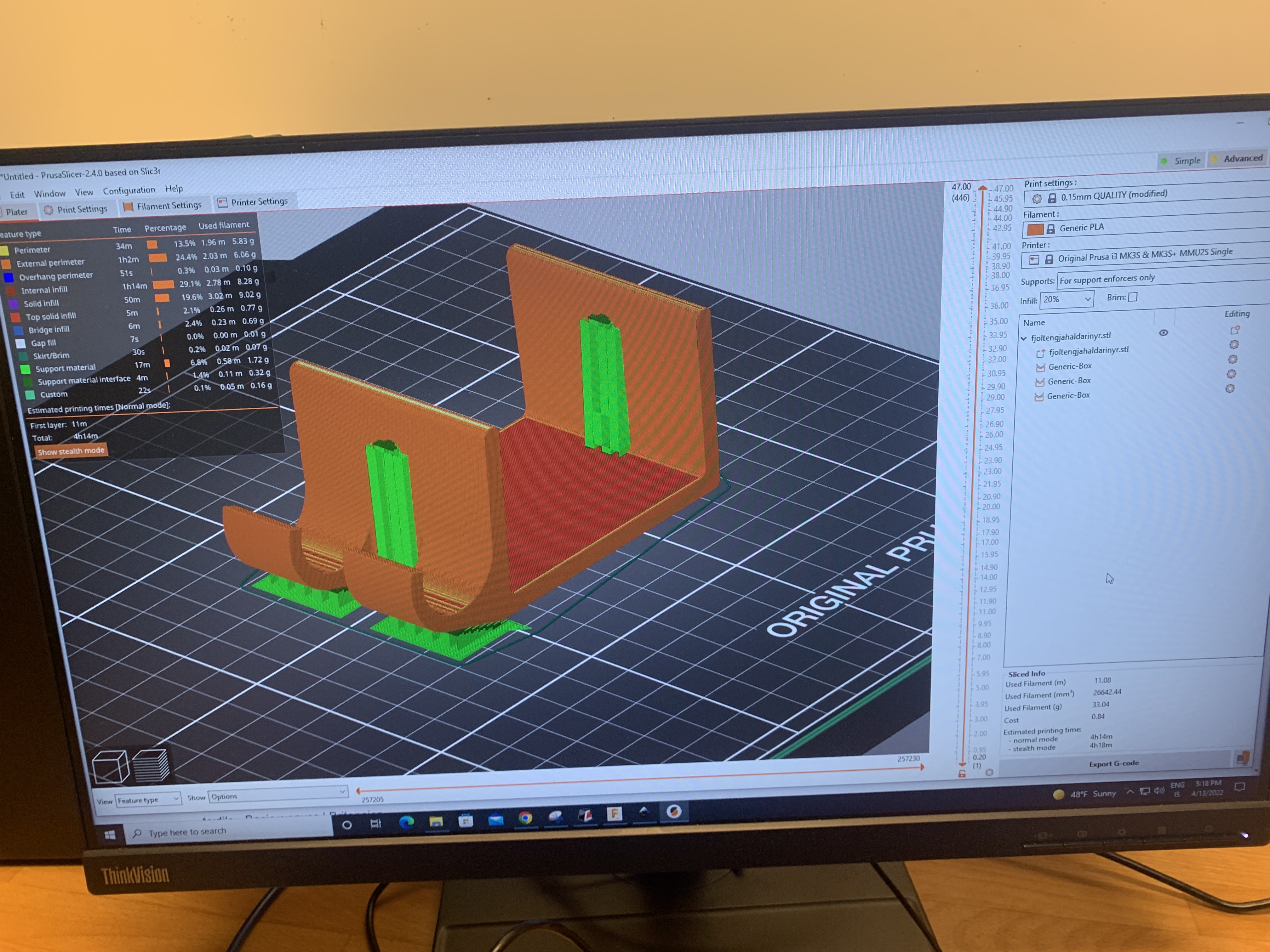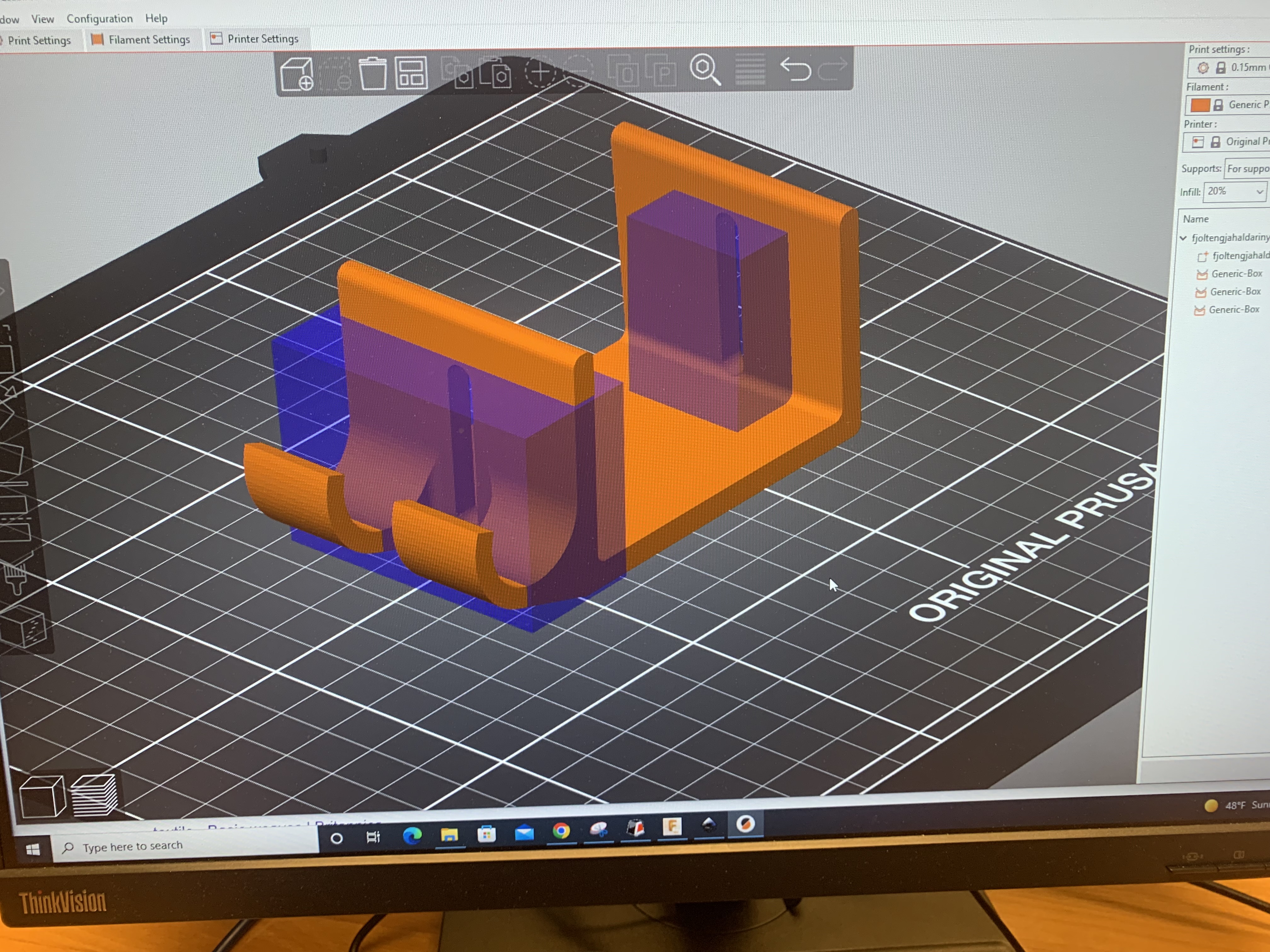 Next I had to save the file as a .stl file do that I could slice it in the prusa application. Next I put supports under the screw holes just to make sure everything printed as it should. Last time around I drew up the object in Fusion 360 but for this assignment I opted for Inventor. The reason for that being that I am more used to drawing up objects in Fusion and after I found out you could export your drawings as .stl as well in Inventor I made my choice. Below you can see how I set it up in the Prusa application: