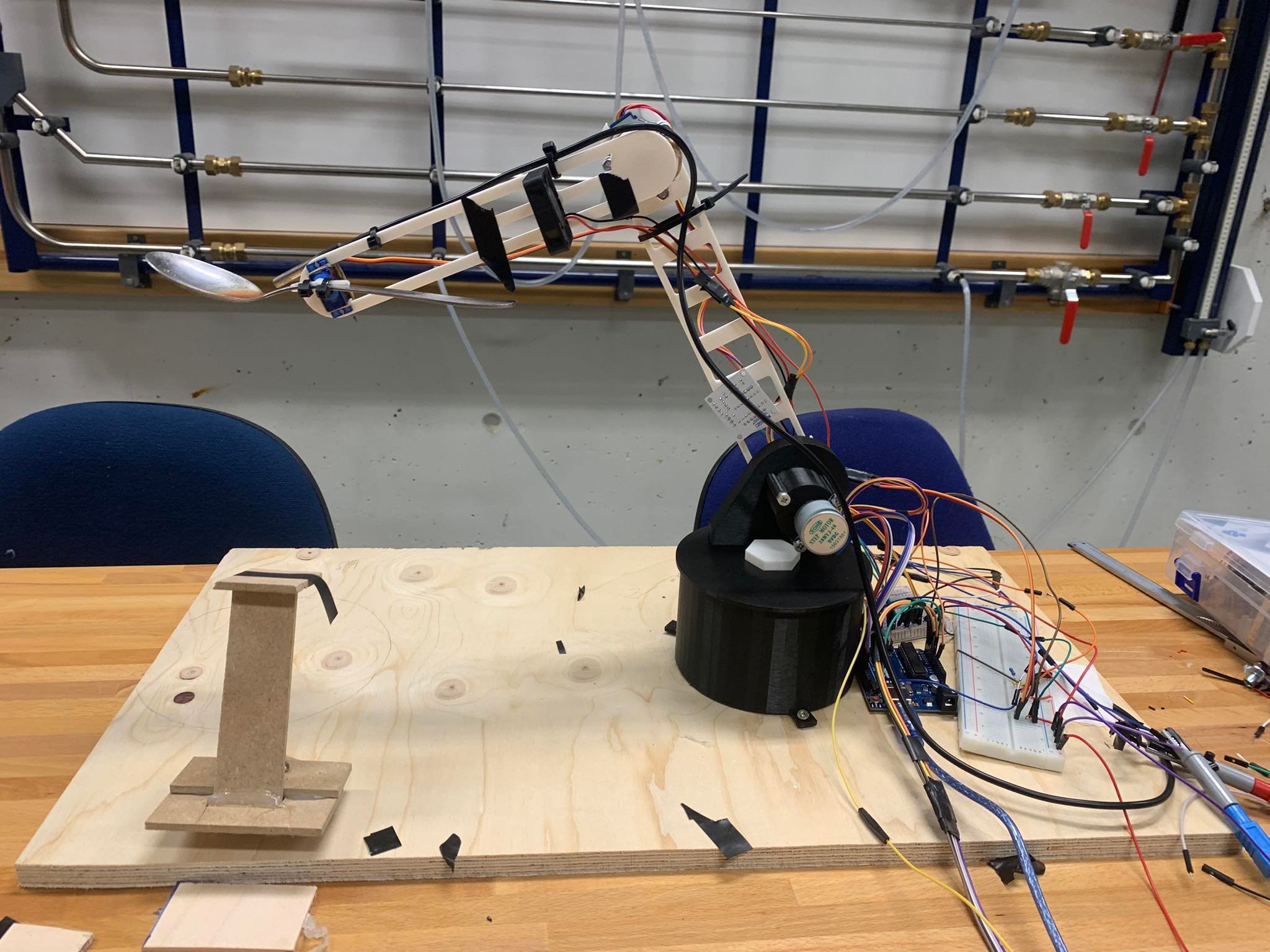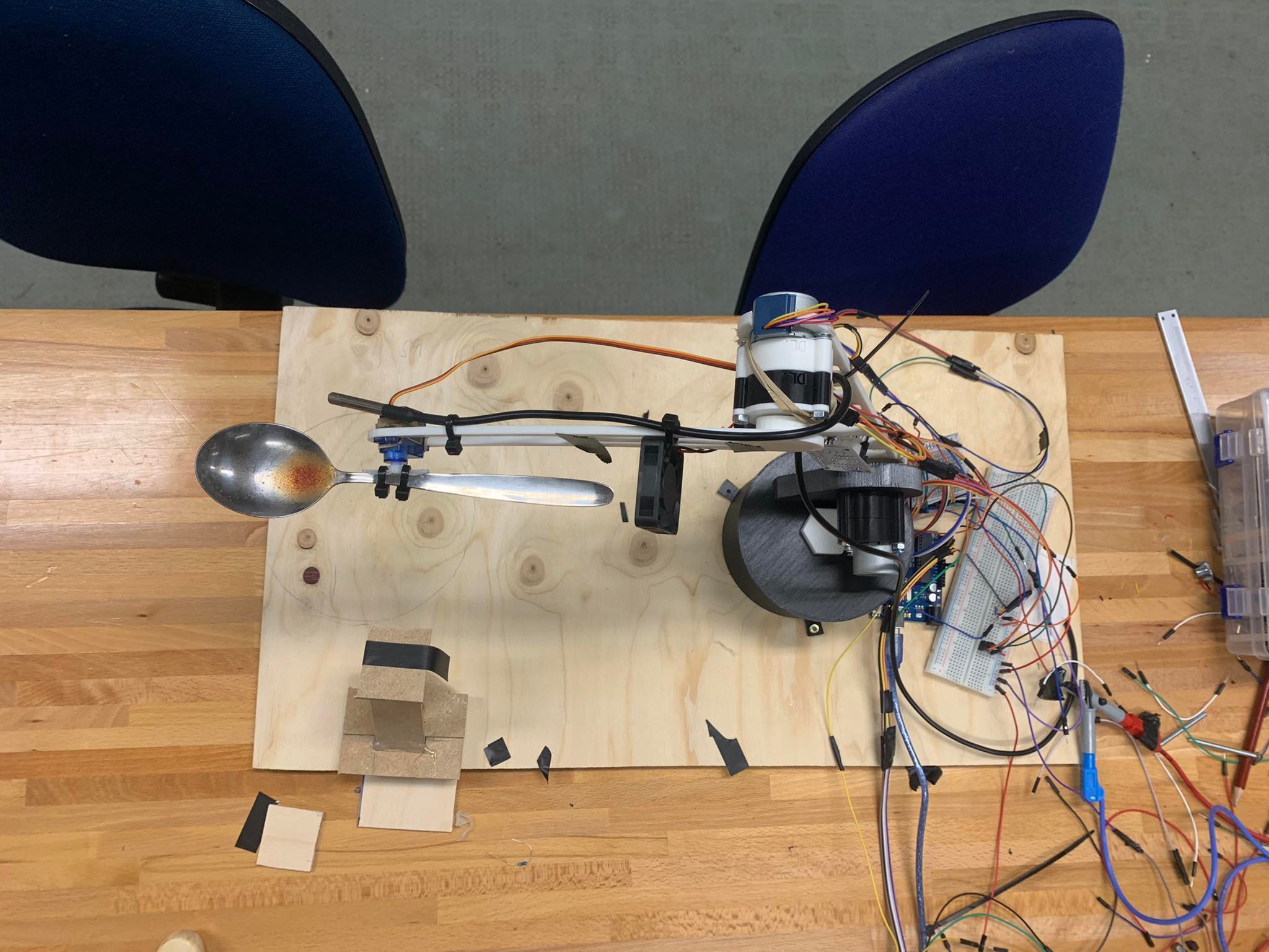 As far as I can tell all of these printers are built in to the Fusion 360 library so that is not a deciding factor. I decided to go for the Prusa MK3+. The reason being that after a quick chat with my teacher, as well as other students taking the course, I came to the conclusion that this printer is the easiest to use. Furthermore I was working on a seperate assignment in another class which consisted of creating a robot which could soup feed a person. To create the robot we 3D printed a lot of the comonents and I'll include a picture of the robot below.
